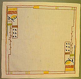 Pieni neliön muotoinen pöytäliina, jonka reunoissa leveähkö käsin ommeltu päärme sekä kapea suoraviivainen reunusraita.. Vastakkaisissa nurkissa suorakaiteen muotoinen kuvioryhmä.