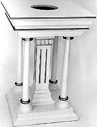 Kastepöytä, jonka jalka- ja pöytälevy ovat neliön muotoiset ja profiloidut. Niiden välissä kulmissa ohuet pyöreät pylväät, jotka ohenevat ylöspäin; antiikin temppelin kattopalkistoa muistuttava pöydänkansirakenne