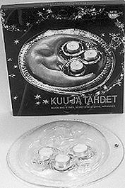 Kynttilänalusta: pyöreä lasinen kynttilänalusta Romantica-sarjasta. Pöydälle asetettaessa alustan vaakatasossa olevat reunat koskettavat pöydän pintaa, mutta keskiosa nousee kohokuvioisena. Kohokuvio esittää hymyilevää, himmeää kuun sirppiä. Sen oikealla puolella kolme syvennystä tuikkukynttilöille, jotka edustavat tähtiä. Lämpökynttilä, 3 kpl: kolme pientä lämpökynttilää alumiinisessa rasiassa. Pakkaus: litteä neliön muotoinen pakkaus. Avataan edestä. Kanteen painettu valokuva kynttilävadista.