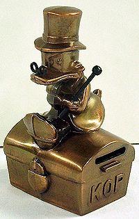 Kokonaan kuparin värinen säästölipas. Roope Ankka istuu lukitun rahakirstun päällä. Kirstun lyhyellä sivulla raha-aukko. Rahakirstun molemmissä päissä kookkain kohokirjaimin: KOP. Pohjassa metallinen lukkolaite. Sisällä kaksi pennin rahaa, toinen vuodelta 1963, toinen vuodelta 1974.