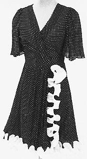 Vyötärösaumallinen, polvipituinen hame, jossa puolipitkät istutetut kellomaiset hihat. Pääntie takaa avara ja pyöreä, edestä V-mallinen, etukappaleet osittain päällekkääin, nepparikiinnitys. Etureunaa ja helmaa kiertää valkoinen aaltomainen nauha.