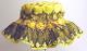 Leveälierinen hellehattu, jonka muotoilussa on tehosteena käytetty kankaan kuviointia. Yhtenäisestä kankaasta kupu muotoiltu poimuttamalla ja ompelemalla kiinni kovikekankaaseen. Lieri laajenee poimutuksista. reunassa kanttaus.