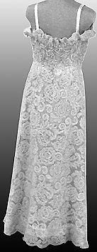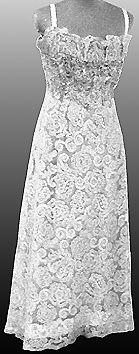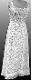 Olkainmallinen, nilkkapituinen, vartalonmukainen juhlapuku. Kankaan kaareva reuna helmassa ja poimutettuna yläosassa. Rinnan korkeudella helmikoristelu sekä edessä että takana. Sivusaumassa vetoketju.