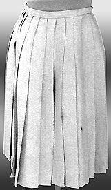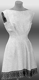 Juhlatakki: vyötärösaumaton suora pitkä takki. Sivusaumoissa halkiot. Puolipitkät istutetut hihat, alareuna käännetty. Suorakulmainen avara pystykaulus, reunassa pieni nappi, ei muuta kiinnitystä. Puku: vyötärösaumaton tyköistuva helmasta leveä hihaton puku. Takana ja edessä keskisauma ja sisäänotot. Pääntie edestä umpinainen, takaa syvään uurrettu V-muoto. Sivulla vetoketju. Kädenaukkoja todennäköisesti pienennetty jälkeenpäin lisäsuikaleilla. Hame: kapea suora hame. Takana alhaalta avoin laskos. Vyötäröllä sisäänotot,sivulla vetoketju ja haka. Kapea vyötärökaitale, ripustuslenkit. Laskostettu hame: lyhyt kokonaan laskostettu hame. Kapea vyötärökaitale, hakaskiinnitys. Ei vetoketjua. Ripustuslenkit.