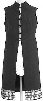 Miehustasta istuva, alaspäin hieman leviävä, puoleen reiteen ulottuva liivi, jossa pystykaulus. Edestä auki, kiinnittiminä pallomaiset koristeet, joissa nepparit.