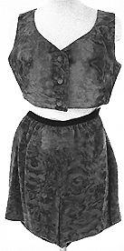 Lyhyet suorat mikrot. Vyötäröllä sisäänotot ja poimutusta. Vyötärönauha, ripustuslenkit ja sivusaumassa vetoketju.