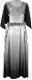 Vyötärösaumallinen nilkkapituinen puku, jossa hameosa edestä suora, takaa loivasta levenevä. Yläosa vartalonmukainen, hyvin avara pääntie, edestä pyöreä, takaa V-malli, keskitakasaumassa vetoketju. Leveät puolipitkät istutetut hihat. Helma ja hihat tummat, keskivartalo vaalea. Saumakohdassa vyömäinen kiinniommeltu kaitale.