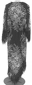 Kulmittaisista huiveista muotoiltu nilkkapituinen puku, jossa hapsut helmassa. Puolipitkät raglamalliset hihat huivien nurkkapaloista. Hapsut hihansuissa,ja sisäpuolella yhteensolmittuna muodostaen sisäsauman. Venemallinen pääntie, oikeassa olkasaumassa vetoketju, nappi ja nappilenkki, vasemmalla puolella nappi.