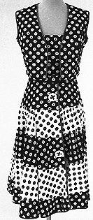 Hame: pohjepituinen kellohelmainen hame. Liivi: vyötärömittainen tyköistuva liivi. Pääntie V-mallinen. Kanttaus hihanaukoissa sekä etureunassa että pääntiellä Toppi: vyötärömittainen tyköistuva toppi. Leveät ulkoreunasta kantatut olkaimet. Sivusaumassa vetoketju.
