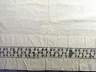 Suorakaiteen muotoinen lakana, jossa toisessa päässä käsinvirkattu pitsi ja nimikoidut kirjaimet SS ( Senni Saksanen ). Lakana todennäköisesti tehty vanhasta lakanasta.