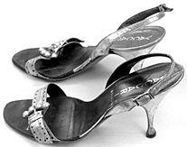 Korkeakorkoiset, kannasta ja kärjestä avonaiset sandaalit, joissa edessä kapea, reunoistaan koristeltu kaarroke ja siinä isohko helmikoristeltu metallisolki. Takaa kantapäätä kiertää kapea, nauhamainen remmi, jossa solki. Korko kapea, ns. piikkikorko. Pohja ohut.