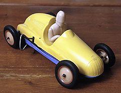 Muovinen leikkiauto. Kuori kilpa-auton muotoon puristettu, sisältä ontto. Pyörät kiinnitetty ohuen metallitangon päähän. Ajaja kiinteä. Auton oikealla kyljellä metallinen koukku, jota kiertämällä auto voidaan vetää, ja auto kulkee "itsekseen" (ei toimi). Vetomekanismi kuoren sisällä.