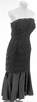 Kainaloiden alta alkava, puolipitkä, vartaloa myötäilevä kotelopuku, jossa kellomainen, vinoon leikattu helma. Pitsi myötäilee pukua helma-osaan saakka. Mukana pitsikankaan pala 13x44, saattaa olla olkain, puvussa takakappaleessa katkottuja lankoja.