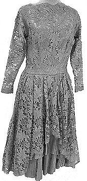 Puolipitkä juhlapuku, jonka aluspuku hameosalta pliseerattua satiinia, yläosa kotelomainen, kainaloiden alle ulottuva. Samaa sävyä oleva pitsine päällyspuku on selästä syvää uurrettu, kimonomalliset pitkät kapeat hihat. Pääntien ja helman etuosan reunalinja myötäilee muodoltaan pitsin kuviointia.
