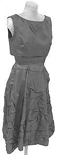 Puku: olkainmallinen pohjepituinen puku.jossa vartalonmukainen yläosa, osittain vuoritettu, osittain tukikankaalla kovitettu. Olkaimet kolme kapeaa nauhaa. Hameosa helmasta levenevä, ryppypintainen. Sivusaumassa vetoketju. Puvun yläosa: lyhyt, juuri rinnan alapuolelle ulottuva, hihaton bolero. Pääntie edestä avara venemalli, takaa syvä V-malli, kiinnitys takana neppareilla, päällä koristerusetti puvun kankaasta.