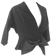 Tyköistuva vyötärömittainen jakku, jossa puolipitkät kimonomalliset hihat. Keskitakasauma ja sisäänotot, edestä muotoonleikattu. Kaulukseton, v-mallinen pääntie, vyötärön kohdalla kaksi punosnappia rinnakkain, niiden alapuolella iso rusetti.