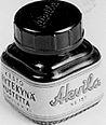 Kuutiomainen lasipullo. Kierrettävä musta korkki. Pulloa kiertää kelta-vihreä etiketti, jossa teksti: Kesto / Täytekynä / mustetta / Oy Akvila H:ki / Akvila / No157. Teksti painettu.