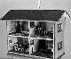 Harjakattoinen, katon toinen puoli saranoitu. Savupiippu sähköputkesta. Neljä huonetta, kaksikerroksinen. Harmaat paperitapetit. Yläkerran vasemmanpuoleinen huone makuuhuone, oikeanpuoleinen olohuone, alakerran vasemmanpuoleinen lastenhuone, oikeanpuoleinen keittiö.