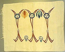 Suorakaiteen muotoinen sohvatyynynpäällinen, jossa toisella puolella suurehko kirjottu kuvio. Ei täytteitä.