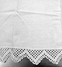 Suorakaiteen muotoinen, reunuskangas, jonka alareunaan on käsinommellen kiinnitetty virkattu pitsi