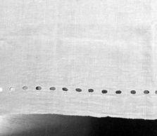 Suorakaiteen muotoinen reunuskangas, jossa molemmissa päissä ja toisella pitkällä sivulla koneommelpäärme, alaeunassa hulpio.