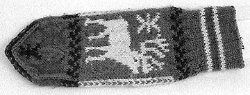 Ranneosa 3x1 joustinneuletta. Kämmenpuoli ristikkomaista kirjoneuletta. Kämmenselkä poro-aiheinen kirjoneule. Peukalossa levennyskiila. Kärkikavennus peukalossa ja lapasen kärjessä leveä nauhakavennus.