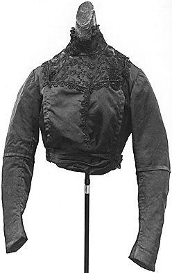 Vyötärölle ulottuva, pitkähihainen, puseromainen puvun yläosa, jossa kapeat istutetut hihat ja pystykaulus. Vuorina vaal.punainen puuvilladamasti, joka on tuettu luilla. Keskiedestä auki, kiinnittiminä hakasia ja neppareita.
