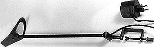 Pöytälevyn reunaan kiinnitettävä valaisin. Varsi pitkä ja kapea. Varren päässä pieni kartiomainen varjostin ja pieni pieni halogeenilamppu.