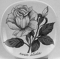 Nelikulmainen, reunat voimakkaasti pyöristetyt. Pohjassa matala jalkarengas, jossa reikä kiinnitystä varten. Pinnan peittää naturalistinen ruusunkukka ja -nuppu lehtineen.