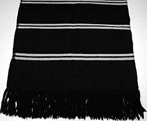 Pitkä ja kapeahko suorakaiteen muotoinen hartiahuivi, jossa pitkät ja tiheään solmitut hapsut.