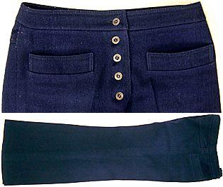 Pitkät, lantiomalliset housut, joissa polvesta alaspäin levenevät lahkeet. Keskeltä edestä avoin, nappikiinnitys. Edessä molemmin puolin upotetut taskut. Lantiolla kaarroke, takana lisäksi kiilat.