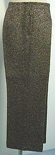 Pitkät, suoralahkeiset housut, joissa vetoketjuhalkio keskellä edessä. Oikealla puolen upotettu tasku, jossa vetoketju. Vyötärö käännetty ripsinauhalla, edessä haka. Haarassa tukikangas.