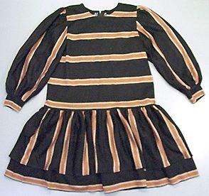 Pohjepituinen puku, missä lantiolla kaksi poimutelmaaa, lyhyempi päälläpäin. Pyöriöltä poimutetut hihat, hihansuut poimutetut rannekkeeseen. Pääntie pyöreä, takana vetoketju. Etu- ja takakappaleet sekä helman pidempi alakappale vaakasuuntaan, lyhyempi päälliosa pystysuuntaan samoin hihat.