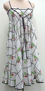 Pohjemittainen, täyskello hellepuku. Yläosassa kapeat vinonauha-olkaimet,jotka jatkuvat edessä solmittavana pitkänä nauhana. Yläosassa kaksinkertainen kangas, nauhakoriste. Alaosa poimutettu vyötärölle, helmassa musta vinonauhakanttaus.