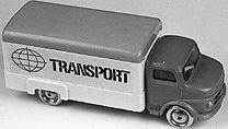 Mercedes-merkkinen kuorma-auto. Molemmin puolin kylkiä painettu teksti: TRANSPORT.