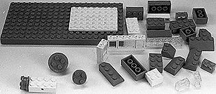 Rakennuslevy: suorakaiteen muotoinen matala alusta, jossa on 10x20 nuppia. Pieni rakennuslevy: suorakaiteen muotoinen litteä alusta, jossa on 8x6 nuppia. Rakennuspalikka, 21 kpl: erilaisia rakennuspalikoita. Suurimmat 4x2 nupin ja pienimmät kahden nupin palikoita. Ikkuna ja ovi, 10 kpl: erilaisia ikunoita ja kaksi "lasi"ovea. Pyörä, 6 kpl: metallisella piikillä varustettuja pyöriä. Keskiössä 4 nuppia. Viidestä pyörästä puuttuu kumirengas. Reiällinen palikka, 4 kpl: suorakaiteen muotoinen, 4x2 nupin palikka, jossa päissä ja pitkillä sivulla reiät pyörien kiinnitystä varten.