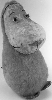 Lähes munanmuotoisen, pyylevän vartalon runko-osa puuta, joka päällystetty sinisellä keinoturkiksella. Kuonon valkea nahkapäällys kulunut ja saumaraot selvästi näkyvissä. Hännän nahkaverhoilu ja tupsu puuttuvat. Lasiset silmät siniset. Kuonoon maalattu punaisella suuret huulet. Korvat puuttuvat ?