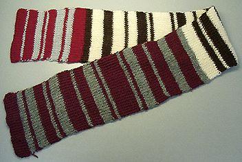 Pitkä, leveähkö, raidallinen kaulaliina, joka on neulottu 1x1 joustinneuloksena.