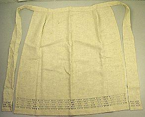 Säären puoliväliin ulottava vyötäröesiliina, jossa vyötärökaitale ja siihen jatketut taakse sidottavat solmiamisnauhat, Vyötäröllä muutama avovekki, reunoissa kapea päärme,