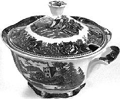 Lautanen,matala,23,5 cm, 7 kpl: matala lautanen. Lautasen reuna pykämäisesti aaltoileva. Matala jalkarengas. Sisäreunaa kiertää ohut häränsilmänauha. Sen alapuolella sinisellä pohjalla kookkaita kukkia. Lautasen keskellä maisema-aihe: etualalla mies purjeella varustetussa veneessä, taustalla vuoria, vasemmalla kookas puu, oikealla rakennus. Kahvikupin aluslautanen,14 kpl: reuna pykämäinen. Sivut kaartuvat ylöspäin. Sisäreunaa kiertää ohut häränsilmänauha. Sen alapuolella sinisellä pohjalla kookkaita kukkia. Keskellä syvennys kahvikuppia varten. Ulkopinta koristelematon. Lautanen, syvä, 23,5 cm,24 kpl: syvä lautanen. Lautasen reuna pykämäisesti aaltoileva. Matala jalkarengas. Lautasen sisäreunaa kiertää ohut häränsilmänauha. Sen alapuolella sinisellä pohjalla kookkaita kukkia. Keskellä maisema-aihe: etualalla vene, jossa on kolme henkilöä, taustalla oikealla rakennuksen edessä vesiratas. Rakennuksesta johtavaa siltaa pitkin kulkee henkilö säkki selässä. Lautanen,matala, 19,7 cm,9 kpl: matala lautanen. Lautasen reuna pykämäisesti aaltoileva. Matala jalkarengas. Lautasen sisäreunaa kiertää ohut häränsilmänauha. Sen alapuolella sinisellä pohjalla kookkaita kukkia. Keskellä maisema-aihe: etualalla rannalla istuu mies onkivapa kädessään, taustalla tuulimylly. Suurempi paistivati, soikea: vadin reuna pykämäisesti aaltoileva. Matala jalkarengas. Sisäreunaa kiertää ohut häränsilmänauha. Sen alapuolella sinisellä pohjalla kookkaita kukkia. Keskellä maisema-aihe: etualalla karjaa ja kolme miestä keppien kanssa, taustalla tiilisiä rakennuksia osittain puiden peittämänä. Pienempi paistivati, soikea: vadin reuna pykämäisesti aaltoileva. Matala jalkarengas. Sisäreunaa kiertää ohut häränsilmänauha. Sen alapuolella sinisellä pohjalla kookkaita kukkia. Keskellä maisema-aihe: mies veneessä ongella, taustalla tiilinen rakennus, vuori ja puita. Kulho, soikea: soikea kulho. Reuna pykämäisesti aaltoileva. Matala jalkarengas. Sisäreunaa kiertää ohut häränsilmänauha. Sen alapuolella sinisellä pohjalla kookkaita kukkia. Keskellä maisema-aihe: karjaa juomassa rannalla, taustalla osin puiden peittämä rakennus. Liemimalja ja kansi: suun reuna ja jalkarengas pykämäisesti aaltoileva. Kaarevakylkinen. Suun reunassa ja jalkarenkaassa kaheahko kukka-aiheinen nauha. Edessä ja takana maisema-aihe: kaksi hahmoa, toinen istuu puunrungon päällä. Taustalla vettä, puita, tiilinen rakennus ja vuoria. Kansi ylöspäin kohoava, kellomainen. Sen reunassa häränsilmänauha ja sinisellä pohjalla kookkaita kukkia. Kannen koristeena maisema-aihe. Nupin päällä kukka. Kastikeastia: kiinteällä aluslautasella varustettu kastikeastia. Astian ja lautasen reuna pykämäisesti aaltoileva. Kaareva kädensija. Kädensijan alaosassa kukkakoriste. Astian ulkoreunaa kiertää ohut häränsilmänauha. Kyljissä maisema-aihe: keskellä purjevene, vasemmalla rakennus, oikealla kirkko. Lautasen sisäreunassa sinisellä pohjalla kookkaita kukkia. Kahvikuppi, 7 kpl: maljamainen kahvikuppi. Varustettu matalalla jalkarenkaalla. Kädensija kaartuva, koristelematon. Sisäreunaa kiertää ohut häränsilmänauha. Sen alapuolella sinisellä pohjalla kookkaita kukkia. Kahvikupin kylkiä kiertää maisema-aihe: mökki, tornilla varustettu tiilinen rakennus, vuoria, purjevene ja rakennus.