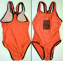 Yksimittainen uimapuku, jossa olkaimet jatkuu yhtenäisenä takakappaleen puolelle. Takakappale melko ylös kiintonainen, olkaimet kiinnittyy keskikohtaan. Kaikki reunat kantatut mustalla. Etukappale vuoritettu.