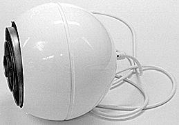 Pallonmuotoinen kattovalaisin. Valaisinta kiertää keskikohdassa vaakasuora ura. Alhaalla irroitettava kullanvärinen metalliritilä. Muovijohto.