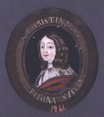 Soikealle lasinkappaleelle tehty maalaus. Naisen rintakuva vasemmalle. Pitkät ruskeat kiharat hiukset. Vaalea puku, punainen viitta.Tumma tausta. Kuvasoikion ympärillä harmaa ja ruskea reuna, jossa on teksti: CHRISTINA REGINA SVECIAE. Suorakaiteen muotoinen pahvikehys. Kuuluu kolmentoista ruotsalaisen hallitsijan muotokuvasarjaan.