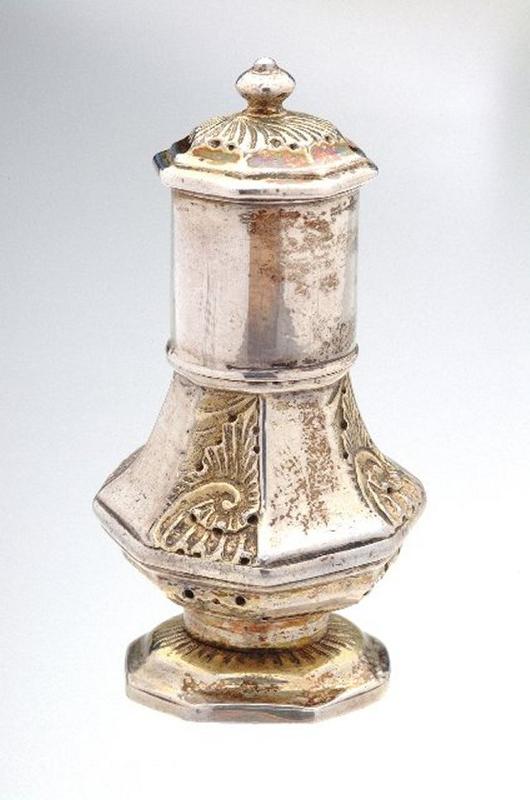 Hopeinen hajusterasia, pullon muotoinen, kahdeksankulmainen, joka toinen sivu koristettu lehdellä ja kiekuralla. Kansi sylinterimäinen, ylinnä nuppi.