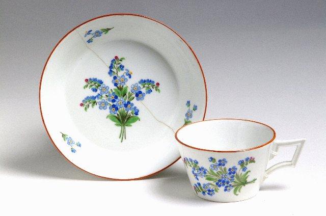Suorareunainen, ylöspäin levenevä kuppi, jossa kulmikas korva. Vati sileäpohjainen, leveälaitainen. Valkoista posliinia, lasitteen alle maalattu kupin sivuilla ja lautasen pohjassa lemmikkikimppu, lautasen reunoilla kolme lemmikinoksaa. Kupissa ja vadissa ruskeanpunainen reuna.