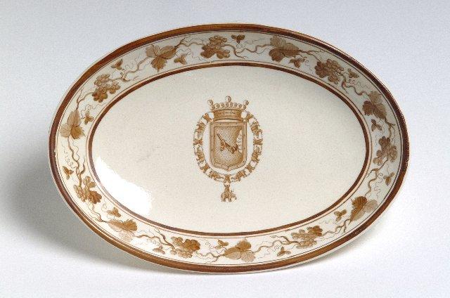 Soikea vati kellertävää Wedgewood-fajanssia. Ruskea maalauskoristelu lasitteen päällä: reunassa kapeiden raitojen välissä viininlehtiköynnös. Keskellä vapaaherrallisen Armfelt-suvun vaakuna Elefanttiritarikunnan ketjujen sisällä. G.M. Armfeltista tuli Tanskan Elefanttiritarikunnan jäsen 1787.