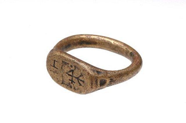 Vaskinen kantasormus, jossa on sinettimerkkien joukossa HI. Puumerkki, ks. kuvat lappuluettelossa.