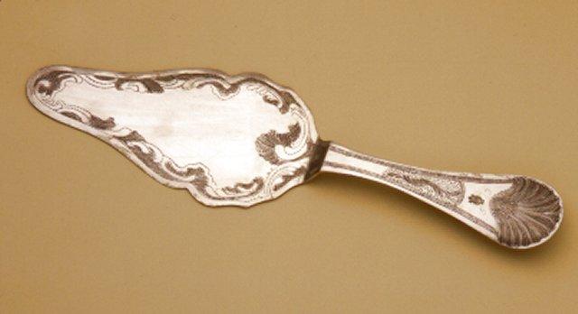 Varsi litteä, ylöspäin levenevä, pää pyöreä. Lapa leveä, kapenee kärkeen päin, reunan ääriviivat kaarevat. Pinta on runsaasti koristettu kaiverretuilla ja punssatuilla rokokookoristeilla: varren päässä simpukka, keskellä kaareva lehti pilkutettu ristikkopohjalla. Lavan reunaa kiertää kaunis rokokoo-ornamentti, simpukoita ym.