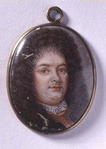 Soikea emaliminiatyyri. Miehen rintakuva oikealle. Suuri musta kihara peruukki, ruskeat silmät. Kullattu haarniska, valkoinen pitsikaulaliina. Siniharmaa tausta. Kääntöpuoli vaaleansininen. Kapea hopeakehys jossa ripustuslenkki. Ostettu Aspelin-Haapkylän kokoelmaan Bukowskilta 75 kruunulla.