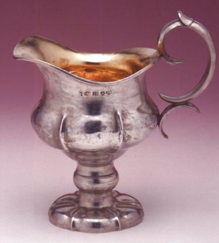 Korkea, jalallinen, pyöreä, koristeena pystyharjanteet ja pullistumat. Leveä, lyhyt nokka, paksu korva. Sisusta kullattu.
